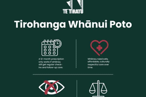 Te Tiratū is calling on the Crown to ensure the implementation of 12-month prescriptions strengthens rather than weakens safety and equity, including through: