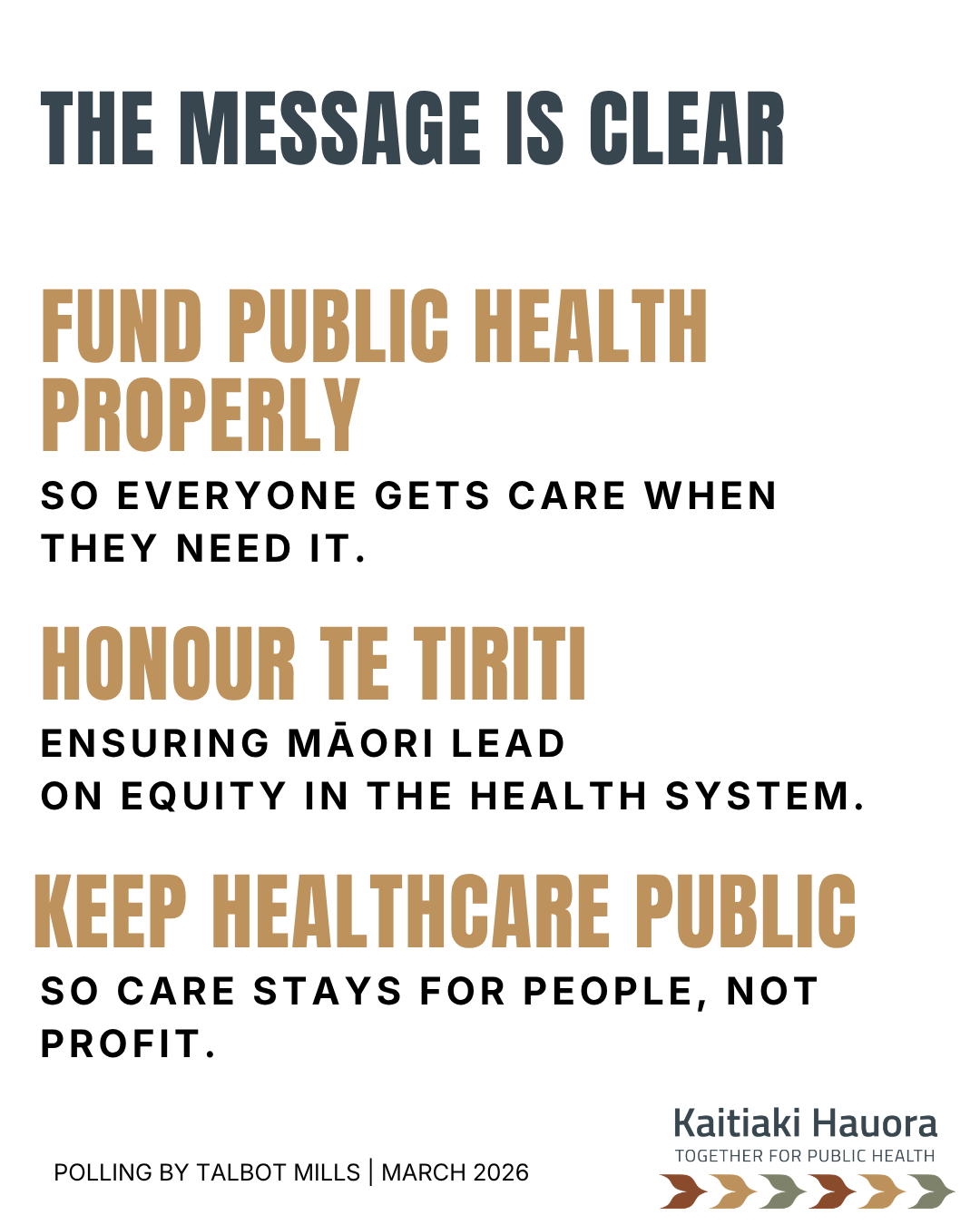 The results signal a broad public expectation that the health system must be properly resourced to meet need. Rob Campbell, Chair of Kaitiaki Hauora, says the findings send a clear message that New Zealanders understand the system is under strain and requires urgent and sustained investment.